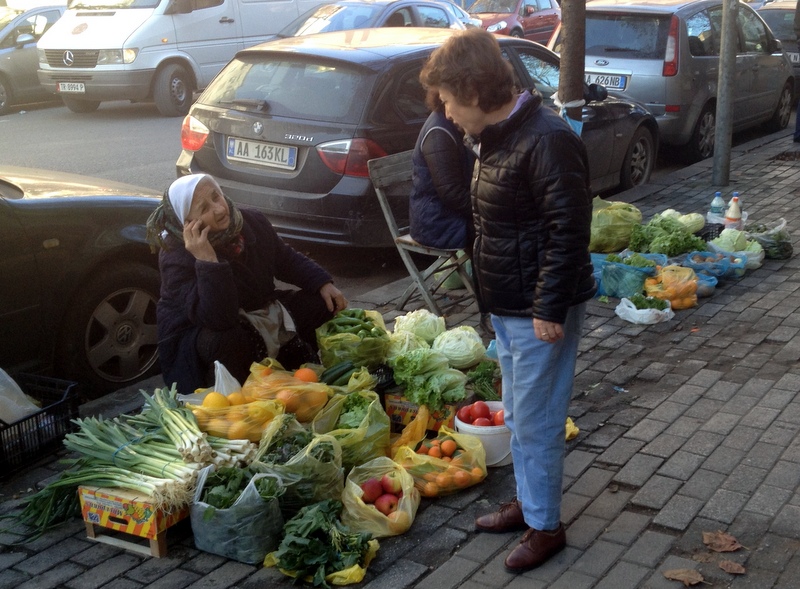 I like biking the best, but walking really brings other highlights into focus. After I dropped off the car, I walked by a souvenir shop. There’s trouble, they have a 100 year old rug like the ones in the museums. I went back to the shop 3 times, I had to accept I was going to pay an extra 100 euro airline baggage fee, sold. I also went to the store where I had bought a t-shirt last time (she gave me a Albanian key chain for free). That particular neighborhood had a small Vegetable Market and the best olives I’ve ever had: not too salty, not covered in oil, perfectly spiced and mostly pit-free. Next time I buy a couple kilos to bring home. On one street it looked like people had cleaned out their closets to see what they could sell and make a little money. The bicycle vegetable market was the best, the customer did all her shopping there.