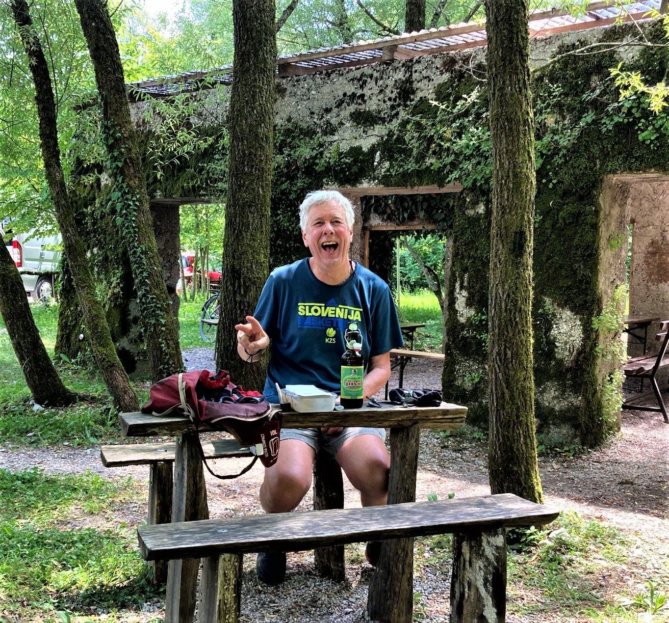 I use to jump start my bike touring by using the train. The e-bike has allowed me to leave Ljubljana at the start of every ride now. My goal is to tour “1 battery charge” for each segment. I went the “back way” to Bohinj Lake via of Zelezniki. Set the camp up, charged the bike and rode into Triglav Park, to the Sport Hotel Pokljuka. Had a great lunch and met Harry the hiker, a new Facebook friend.
